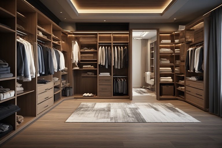 Bespoke walk-in wardrobes intended for comfort, clarity, and luxury include defined storage areas.